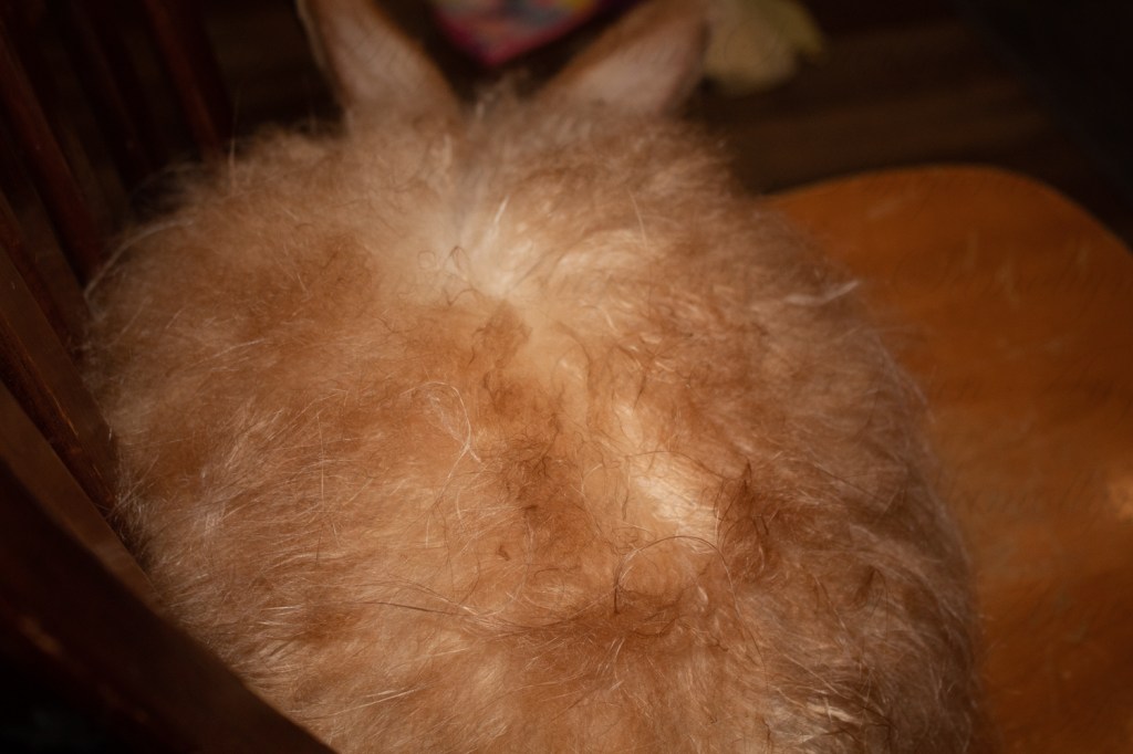 Ollie is a red satin angora. He was born here at Samollynn last year and has proven to be an amazing wooler. He was born of a red eyed white satin, Everest, and a chocolate satin, Stewart. Ollie is still young and not sure about things yet. His father was the same way and cam out of his shell after he turned one, so hopefully Ollie will be the same way. He has an amazing red sheen to his coat and his yield is impressive for a satin. I can’t wait to see the litter he will sire this year. Here is Ollie.